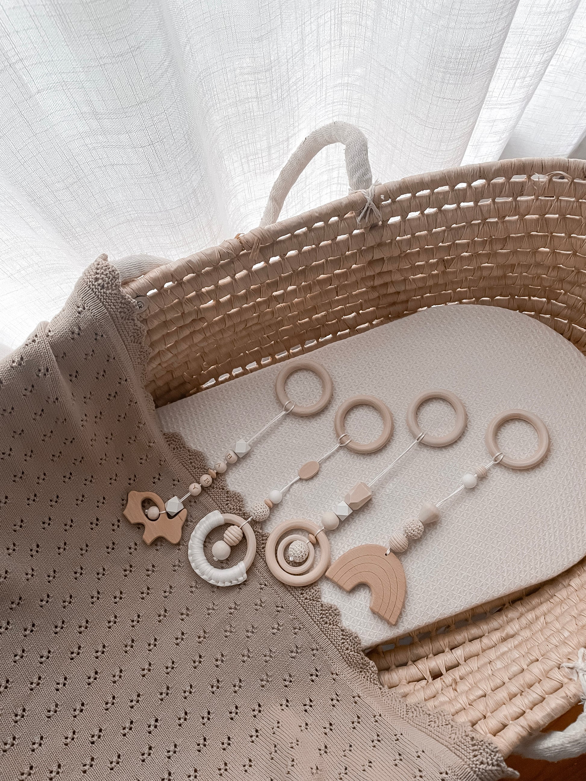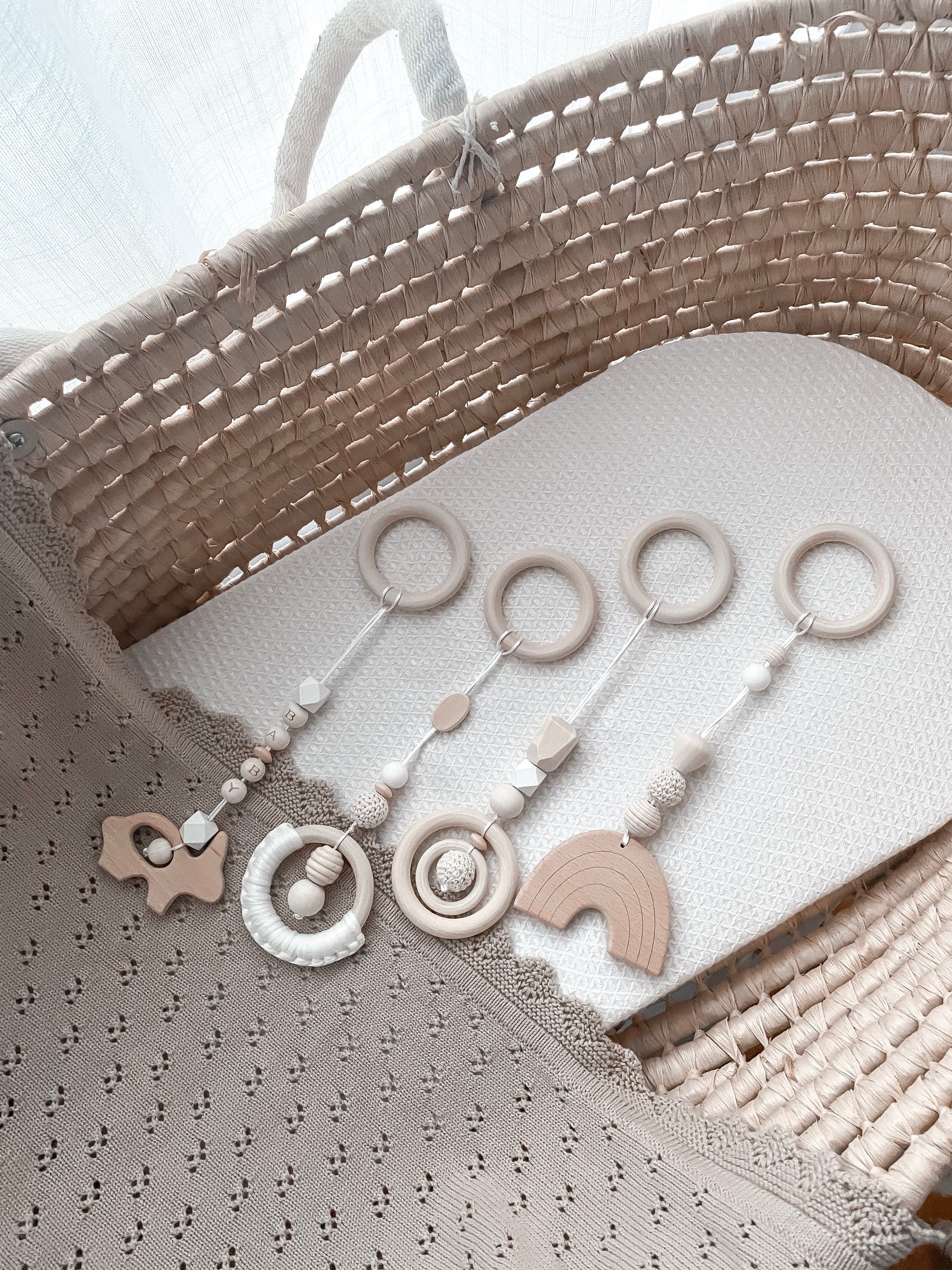 Handcrafted from high-quality beech wood, these hanging pendants are designed to soothe teething discomfort and support early sensory development. Whether attached to a gym frame, stroller, or crib, they help promote grasping, reaching, and fine motor skills—all while adding a warm, natural touch to your space.