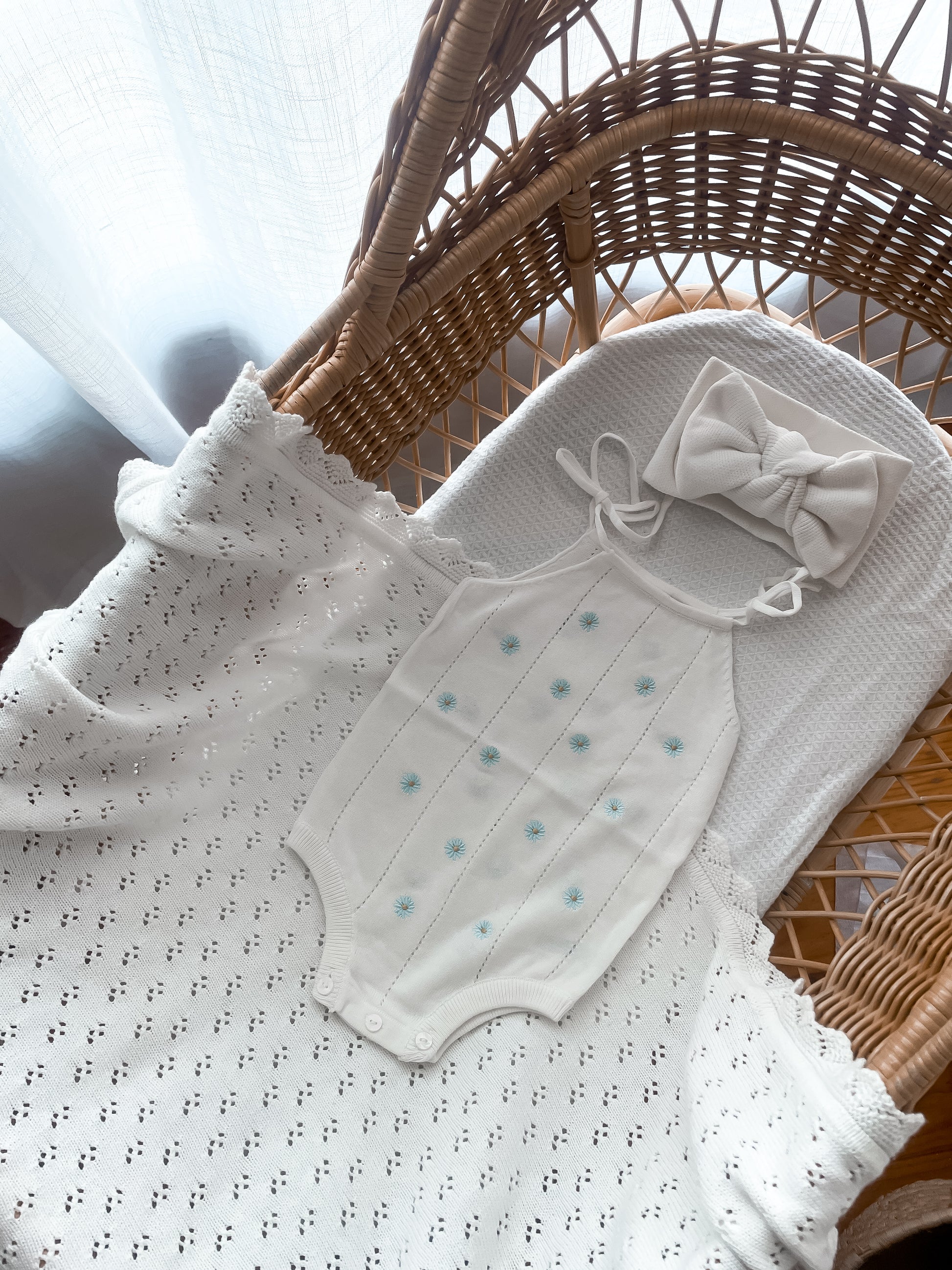 Soft, breathable, and made for play. This 100% cotton romper features a delicate blue daisy print on a classic milk base. A summer essential on its own or layered with knits and tights for cooler days.