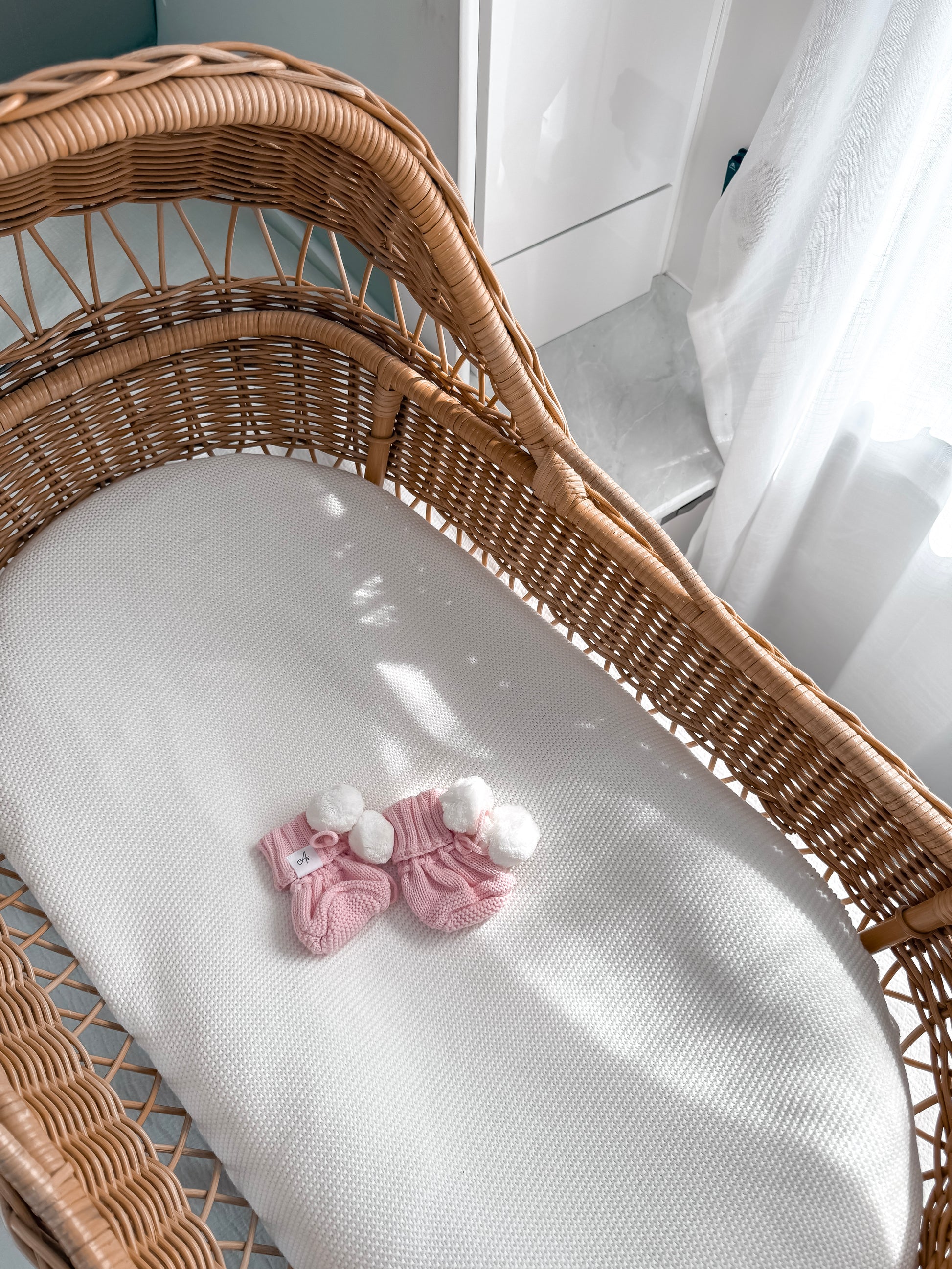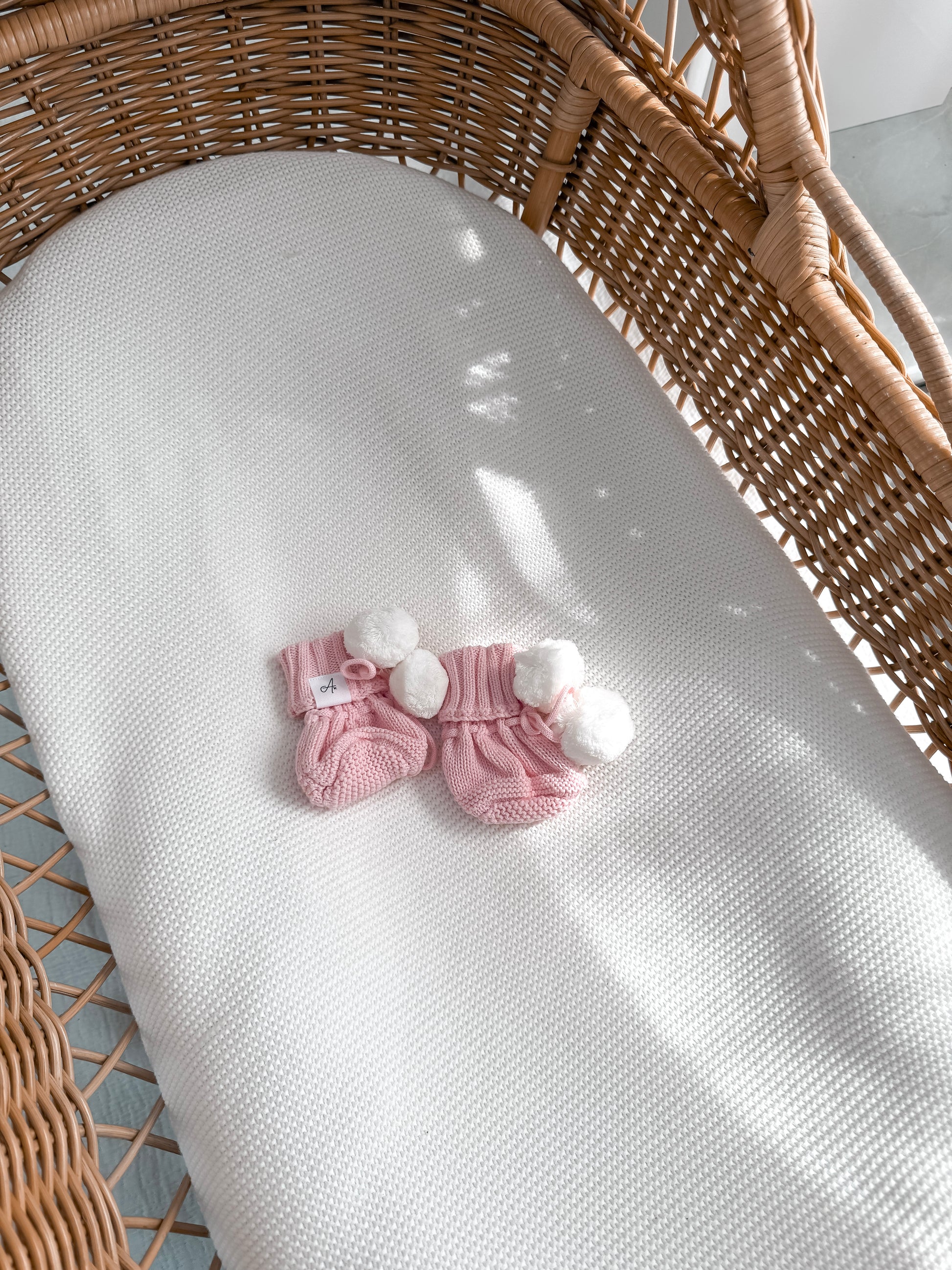 Soft, cozy booties with playful pom poms, perfect for keeping tiny feet warm and comfortable.