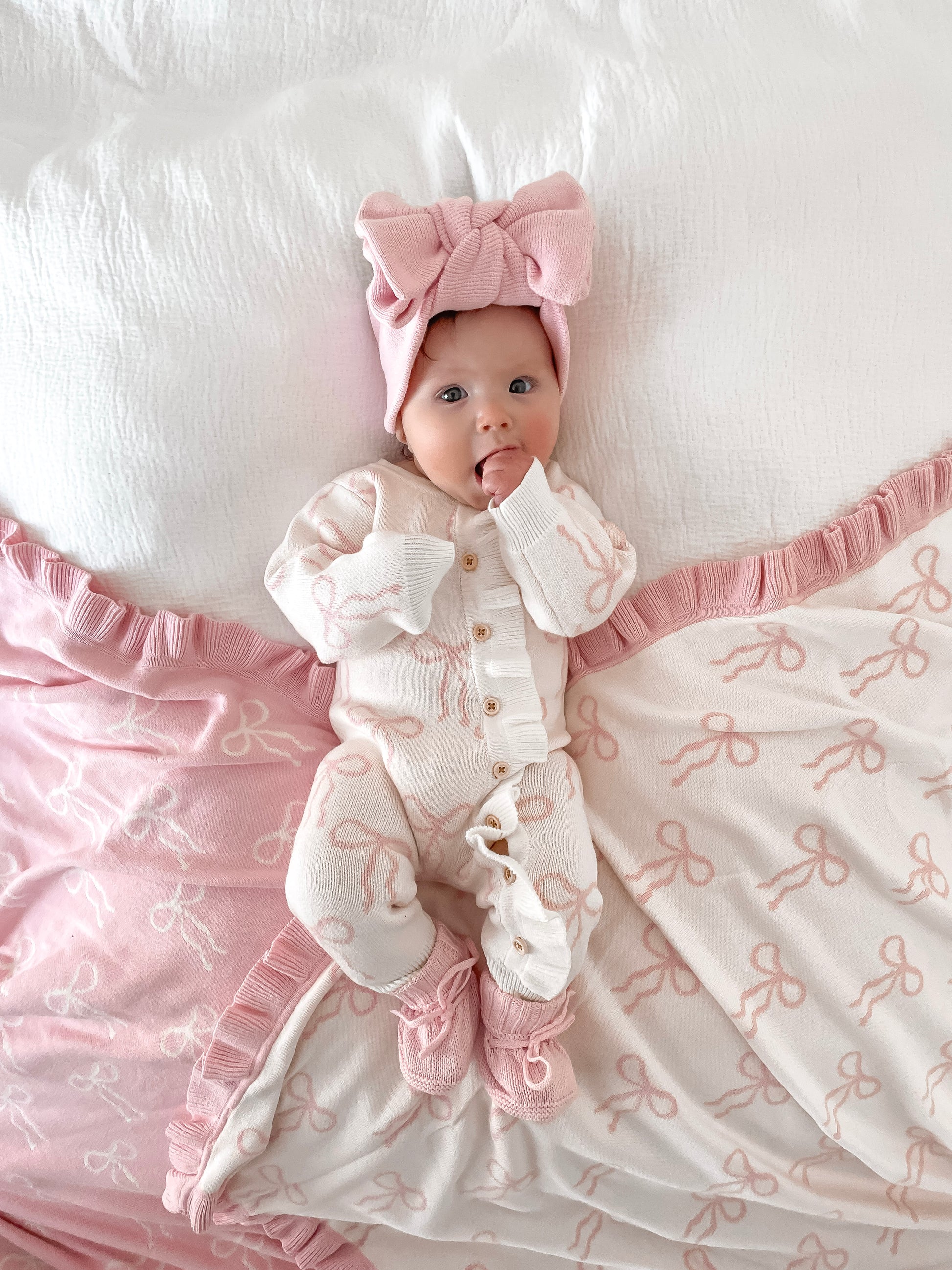 Wrap your little one in soft, breathable comfort with this reversible blanket. Made from 100% organic cotton, it features a charming bow print on one side and a complementary soft design on the other, perfect for snuggling, playtime, or stroller walks.