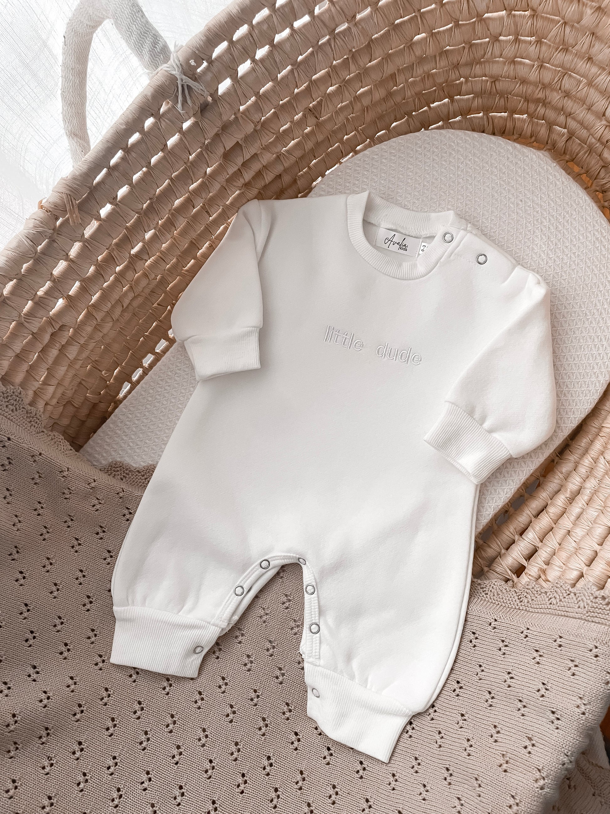 A playful everyday essential made from soft, breathable 100% cotton. With its “Little Dude” graphic and neutral tone, this long sleeve onesie brings charm and comfort to your little one’s wardrobe. Designed for easy changes and cozy all-day wear.