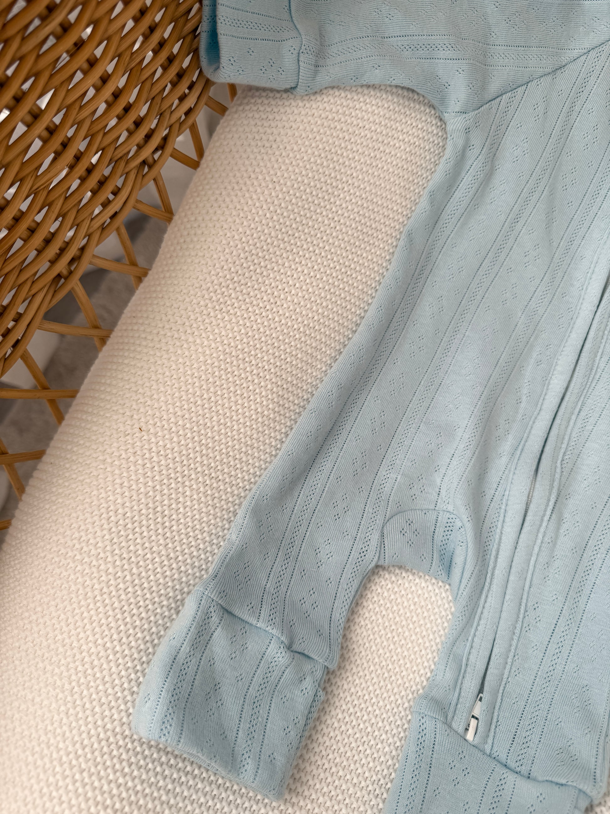 A soft and stylish zip-up romper with delicate pointelle detailing, perfect for everyday comfort and easy dressing.