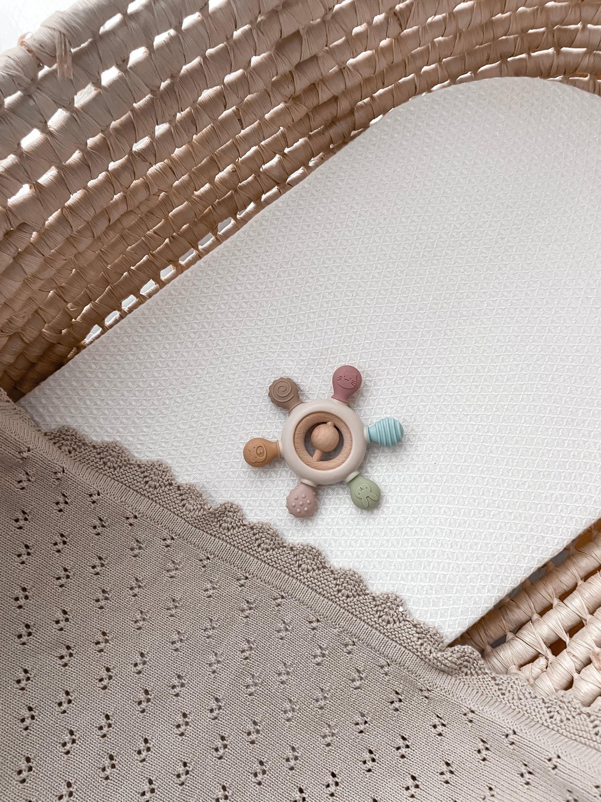 A beautifully made with soft, textured silicone and a smooth wooden centre that feels sturdy but gentle. I also love that it offers different textures for bub to explore which will be perfect for soothing sore gums when the time comes.